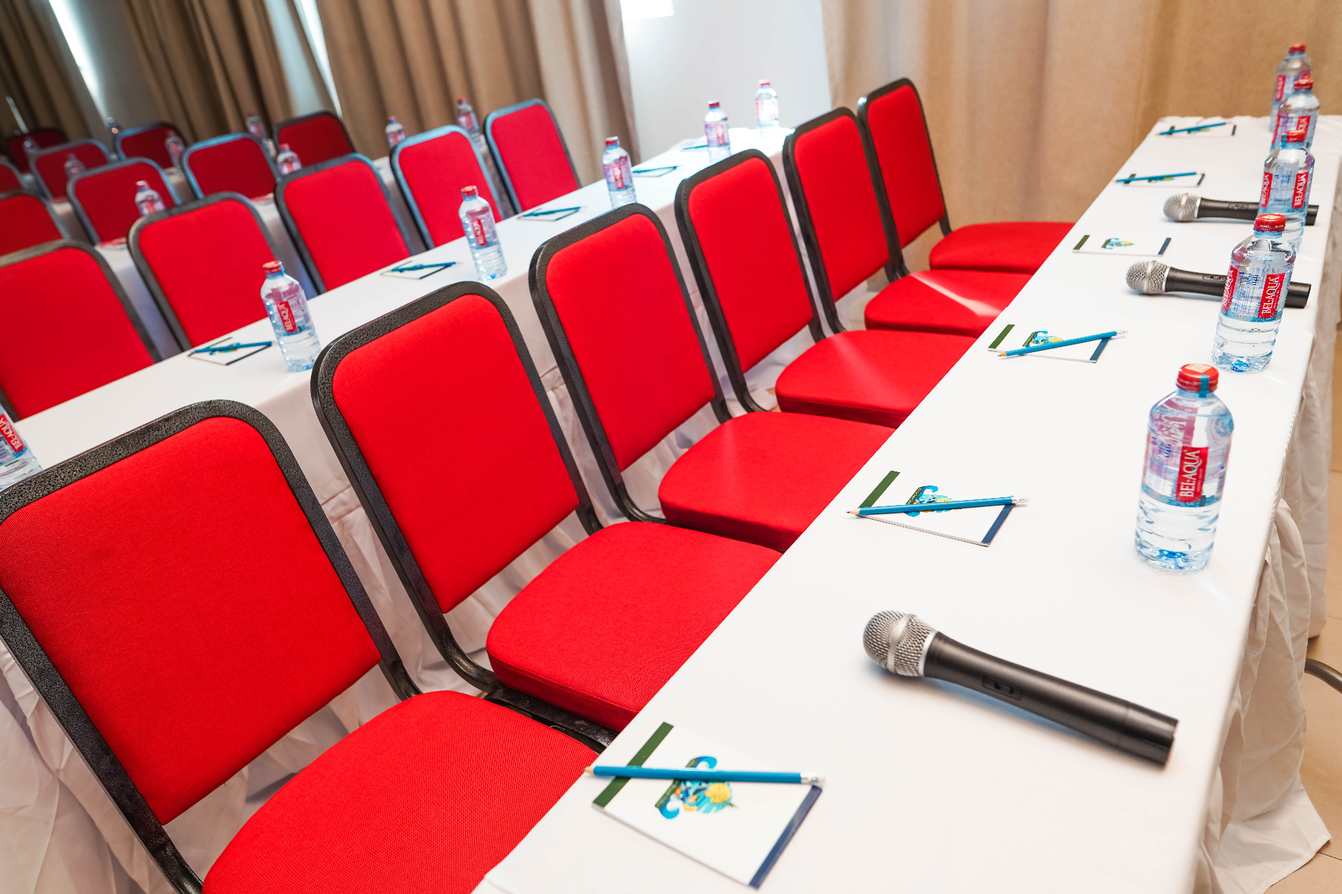 Ideal for training sessions and workshops. Comfortably seats up to 60 delegates with individual desks, microphones, and bottled water service.
